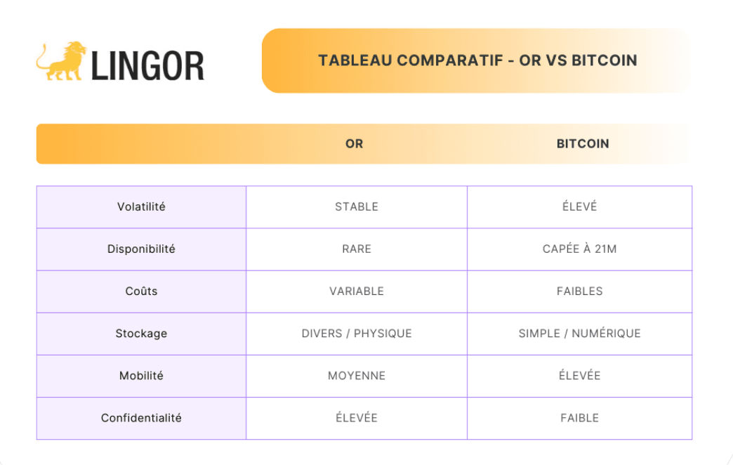 Maintenant, comment l’Or se compare-t-il face au Bitcoin ? Pour faciliter la comparaison, le tableau suivant vous en donnera un bon aperçu :