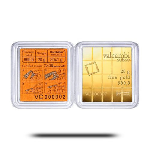 Ces mini lingots d’or Valcambi de 20 x 1 gramme combinent les avantages d’un lingot de 20 grammes avec la flexibilité de séparer les barres de 1 g d’or. Ces lingotins sont présentées dans un emballage scellé qui indique le poids, la pureté, le logo et l’authentification.